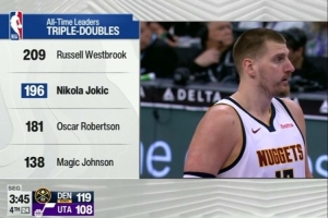 此役,约基奇轻松写意拿下生涯第196个三双,继续追逐威少的209次三双纪录。