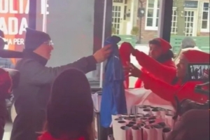 在队伍的最前端,可以看到球迷们进入一栋建筑领取加拿大的球衣,视频中有一名球迷将一件蓝色的意大利儿童球衣交给志愿者,后者递给他一件红色的加拿大球衣。实际上,志愿者们并没有真的在收集意大利球衣,只是为了免费发放加拿大球衣。