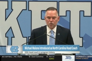 体育资讯4月8日讯 今天,迈克·马龙作为新任主帅参加了北卡大学的新闻发布会。